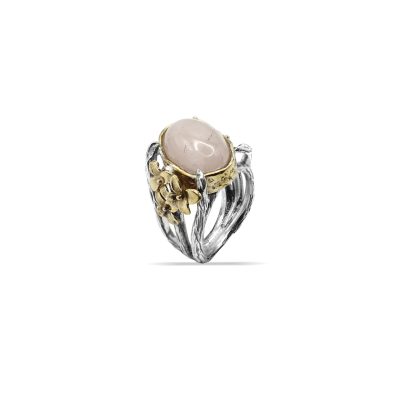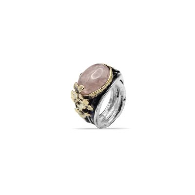 Anello in argento con motivo floreale in bronzo e quarzo rosa MADE IN ITALY