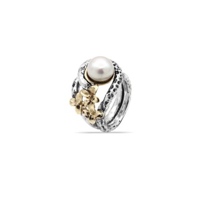 Anello in argento con motivo floreale in bronzo e perla MADE IN ITALY