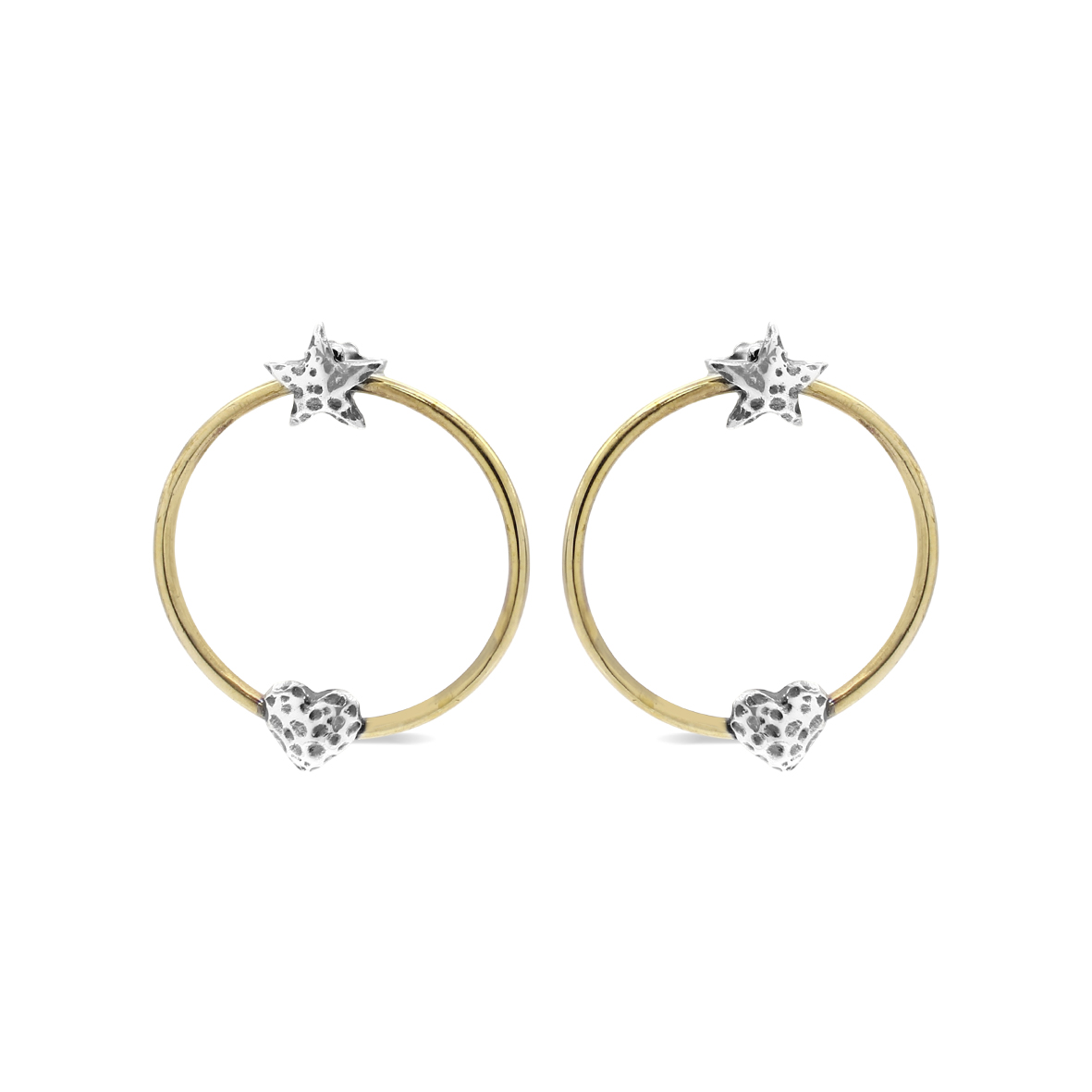Orecchini a cerchio in bronzo con cuore e stella in argento, realizzati a mano. MADE IN ITALY